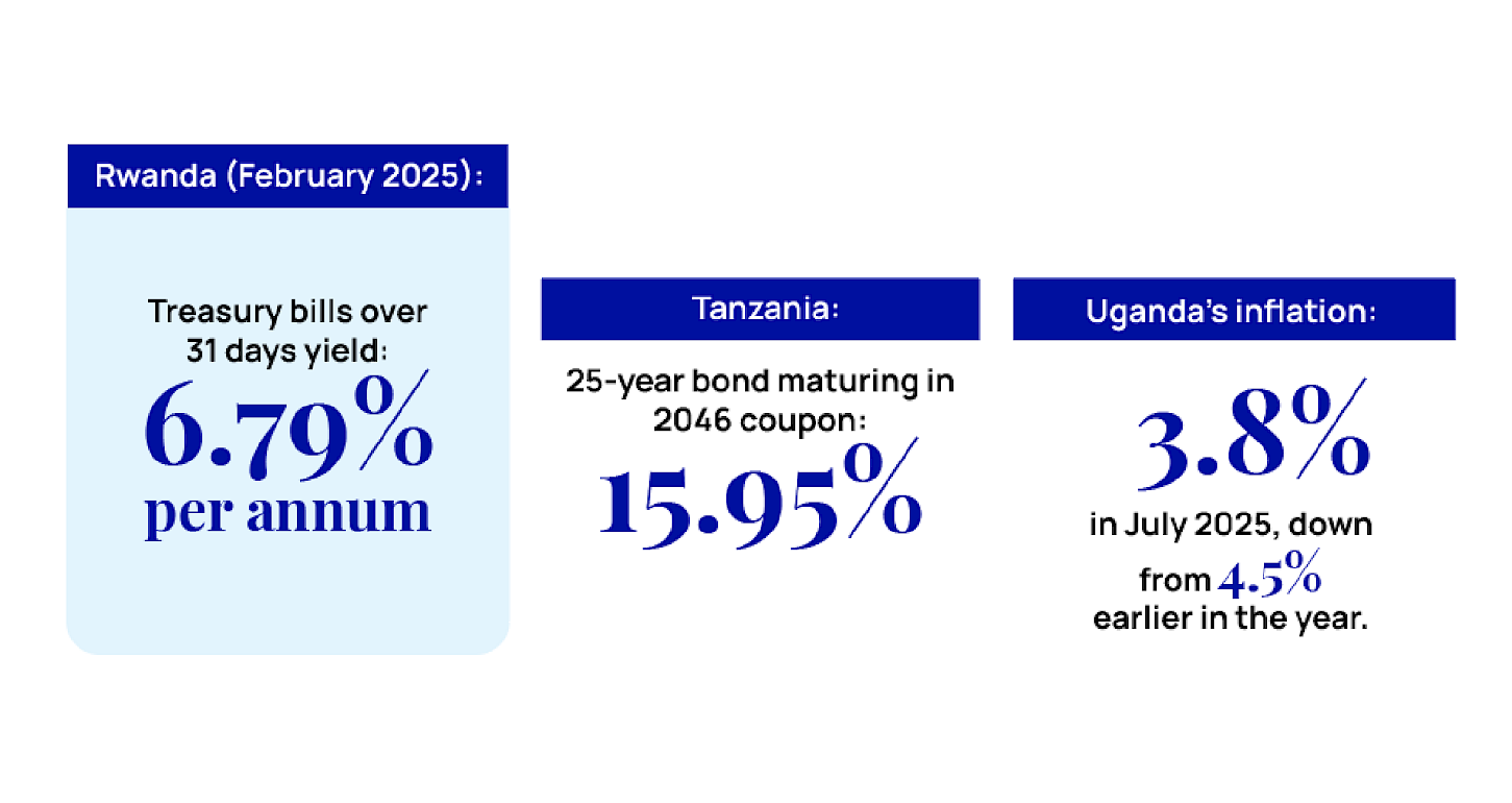 Across the East African region, each country’s bond market tells a different story. Kenya offers the deepest and most liquid market, allowing large institutional investors to move in and out with relative ease, though yields are lower. Tanzania provides attractive mid-teen coupon rates on its long-term bonds, which draw yield-seeking investors willing to accept less secondary market liquidity. Rwanda’s small market caters to specialized investors who adopt a buy-and-hold strategy, given its limited trading activity.